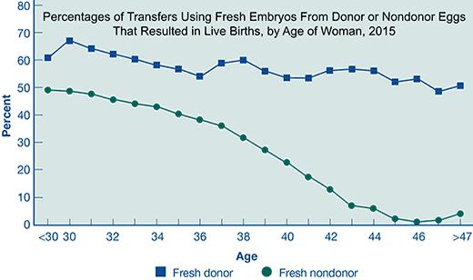 在2015年CDC陈说的这张图表中,绿线闪现运用女性自己的卵子按年岁分的试管婴儿成功率蓝线闪现按受体女性年岁运用供体卵的成功率。