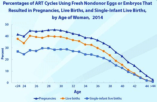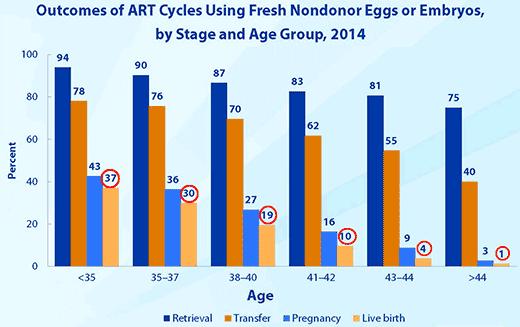 该图表也来自2014年CDC陈说。每个周期初步试管婴儿移植后出血的不同年岁组的泰国试管婴儿费用试管婴儿活产率以赤色圈出。还闪现了试管婴儿周期的百分比,它使得它抵达了卵子回收,胚胎移植和妊娠。